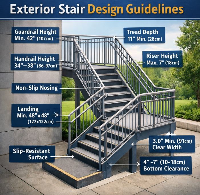 외부 계단을 설계할 때 반드시 따라야 하는 법적 기준은 「건축법 시행령」 및 「건축물의 피난·방화구조 등의 기준에 관한 규칙」에 명시되어 있다. 해당 기준에 따르면 외부 계단은 일정 너비 이상을 확보해야 하며, 피난용 계단의 경우 방화 성능을 갖춘 재료로 만들어져야 한다. 특히 다중이용시설이나 고층 건물의 경우, 피난계단은 연기의 침투를 막는 구조를 갖추고 있어야 하며, 실외에 위치하더라도 일정 거리마다 대기 공간(피난쉼터) 등의 확보가 요구된다. 계단의 단 높이(라이저)는 일반적으로 150mm~180mm가 적정하며, 발판 깊이(트레드)는 최소 250mm 이상을 확보해야 한다. 그러나 외부 계단의 경우 눈, 비, 먼지 등에 노출되기 쉬워, 미끄럼 방지 기능이 강화된 마감재 사용이 권장된다. 표면에 요철을 두거나, 미끄럼 방지 고무, 금속 스터드, 배수홈 설계 등이 일반적으로 사용된다. 또한 외부 계단은 이용자의 심리적 안정감을 고려해 폭이 넓게 설계되는 경우가 많으며, 최소 폭은 1.2m 이상이 권장된다. 계단 난간의 높이 또한 중요한 설계 요소 중 하나이다. 보통 1.1m 이상의 난간 높이를 확보해야 하며, 어린이 보호를 고려하는 공간에서는 난간 간격을 10cm 이하로 유지하도록 권고되고 있다. 이는 어린이의 추락사고를 방지하기 위한 최소한의 안전장치이며, 최근에는 유리 난간이나 스틸 프레임을 활용하여 미관과 안전성을 동시에 확보하는 설계가 증가하고 있다. 외부 계단은 일반적인 실내 구조물과는 달리 기후 조건에 매우 민감하다. 예를 들어 강설량이 많은 지역에서는 계단 위에 눈이 쌓일 경우 매우 심각한 낙상 위험이 발생할 수 있으므로, 계단의 기울기를 완만하게 설계하고, 난방판넬이나 열선 설치를 통한 제설 기능을 고려해야 한다. 또한 배수 시스템이 제대로 작동하지 않으면 물이 고이거나 결빙되어 미끄럼 사고로 이어질 수 있기 때문에, 배수홀 설계나 경사각도 설계 역시 중요 요소로 포함된다. 더 나아가, 최근에는 친환경 설계와 유니버설 디자인 개념이 접목되어, 누구나 안전하고 편리하게 이용할 수 있는 외부 계단이 각광받고 있다. 태양광 조명을 활용하여 야간 시인성을 확보하거나, 진동 및 하중을 센서로 감지하여 유지보수 시기를 자동 알림하는 스마트 계단 시스템 등이 도입되면서, 외부 계단은 단순한 이동 수단에서 지능형 안전 구조물로 진화하고 있다.