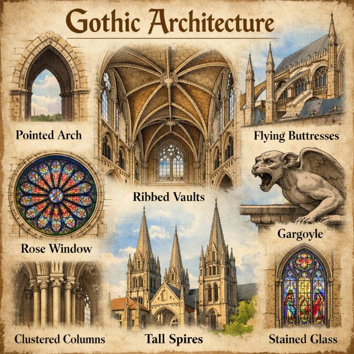 고딕 양식은 그 장대한 외관과 화려한 장식 외에도, 기능적으로도 매우 뛰어난 구조 시스템을 갖추고 있다. 그 중심에는 첨탑(spire), 플라잉 버트레스(flying buttress), 그리고 리브 볼트(ribbed vault)라는 세 가지 핵심 구조적 요소가 있다. 이들은 단순한 미적 장식이 아니라, 고딕 건축이 기존의 중세 구조 기술에서 진일보할 수 있도록 만든 혁신적 발명품이었다. 첫째, 첨탑은 고딕 양식의 가장 상징적인 요소 중 하나로, 하늘로 뻗어 있는 형태를 통해 신에게 가까이 다가가고자 하는 인간의 열망을 표현한다. 첨탑은 주로 성당의 정면 혹은 교차부에 설치되며, 그 높이는 종종 수십 미터에 이르렀다. 첨탑은 시각적으로 수직선을 강조함으로써 건물 전체의 상승감을 극대화했으며, 멀리서도 눈에 띄는 시각적 랜드마크로 기능하였다. 구조적으로는 석조 기술의 극한을 시험하는 요소이기도 했다. 둘째, 플라잉 버트레스는 고딕 건축의 구조적 안정성을 확보하는 데 핵심적인 역할을 하였다. 이전 로마네스크 양식에서는 벽을 두껍게 쌓아 외압을 버텼지만, 고딕 양식에서는 높은 천장과 큰 창을 만들기 위해 내부 공간의 무게를 외부로 분산시킬 필요가 있었다. 이때 사용된 것이 바로 플라잉 버트레스이다. 이는 건물 본체에서 떨어진 외부 지지대가 반아치 형태로 연결되어 하중을 분산시키는 구조로, 고딕 양식의 높은 벽과 스테인드글라스를 가능하게 만든 핵심 기술이었다. 셋째, 리브 볼트는 천장 구조를 보다 가볍고 안정적으로 만드는 데 기여했다. 이는 석재 리브를 통해 하중을 집중시키고, 그 사이에 비교적 가벼운 재료로 천장을 채우는 구조 방식이다. 리브 볼트는 구조적 효율성뿐 아니라, 미적인 효과도 뛰어났다. 천장의 리듬감 있는 곡선은 시선을 위로 끌어올리고, 공간 전체에 긴장감과 생동감을 부여하였다. 이 세 가지 구조요소는 고딕 양식이 단순히 아름다운 양식이 아니라, 기술적 진보의 상징임을 보여준다. 오늘날에도 많은 현대 건축가들은 이 구조 요소들을 분석하고, 새로운 디자인에 접목시키는 시도를 계속하고 있다. 이는 고딕 양식이 단지 과거의 유산이 아니라, 여전히 살아 숨쉬는 건축 철학으로 기능하고 있음을 의미한다. 이처럼 고딕 양식의 구조적 특징은 단순히 외형적인 화려함에 머무르지 않고, 당시 사람들의 철학, 기술력, 종교적 열망이 응축된 결과물이다. 첨탑, 플라잉 버트레스, 리브 볼트의 조합은 오늘날까지도 건축학적 교육 및 실제 설계에서 중요한 연구 대상이 되고 있다.
