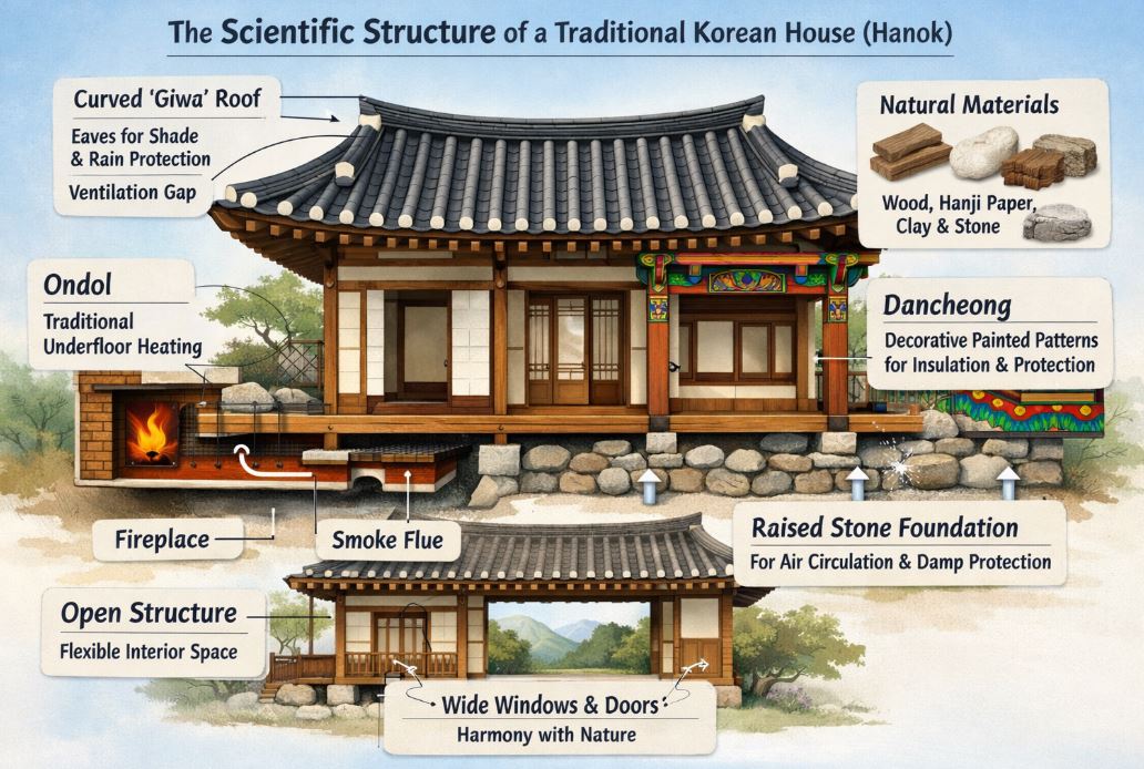 제목은 태그 없이 20자 이상 작성해줘 한국 전통 가옥의 과학적 구조